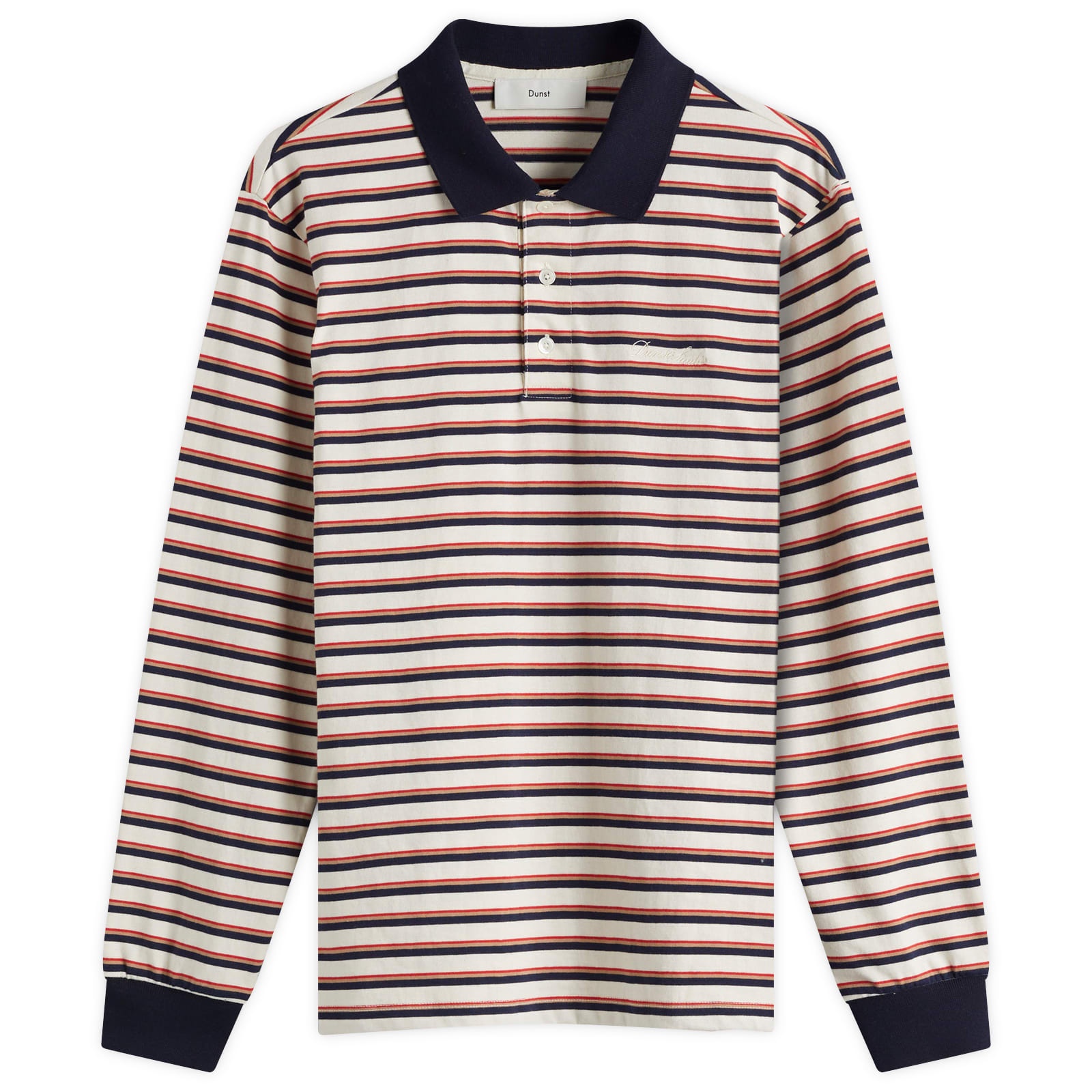 DUNST, renowned for its minimalist yet modern designs, offers a fresh take on casualwear with this unisex multi-stripe t-shirt. Featuring clean, streamlined style and striking stripe pattern, this versatile long sleeve is complete with a contrast collar and cuffs, three-button placket and embroidered logo detail on the chest. - 100% Cotton - Regular Fit - Contrast Collar & Cuffs - 3-Button Placket - Embroidered Branding