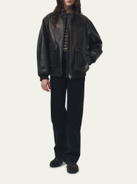 Dunst unisex aviator jacket in smooth leather Stand collar; two-way zip-front Dropped shoulders Long sleeves with rib-knit cuffs Flap pockets with snaps Blouson fit Rib-knit hem Leather Lining: Polyester Professional cleaning recommended Imported Online Inquiries: BGS21_T6XEU| Store Inquiries: #5061019