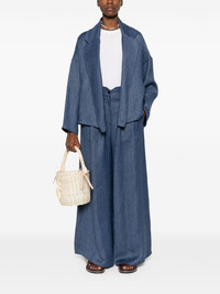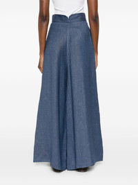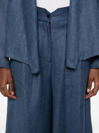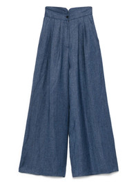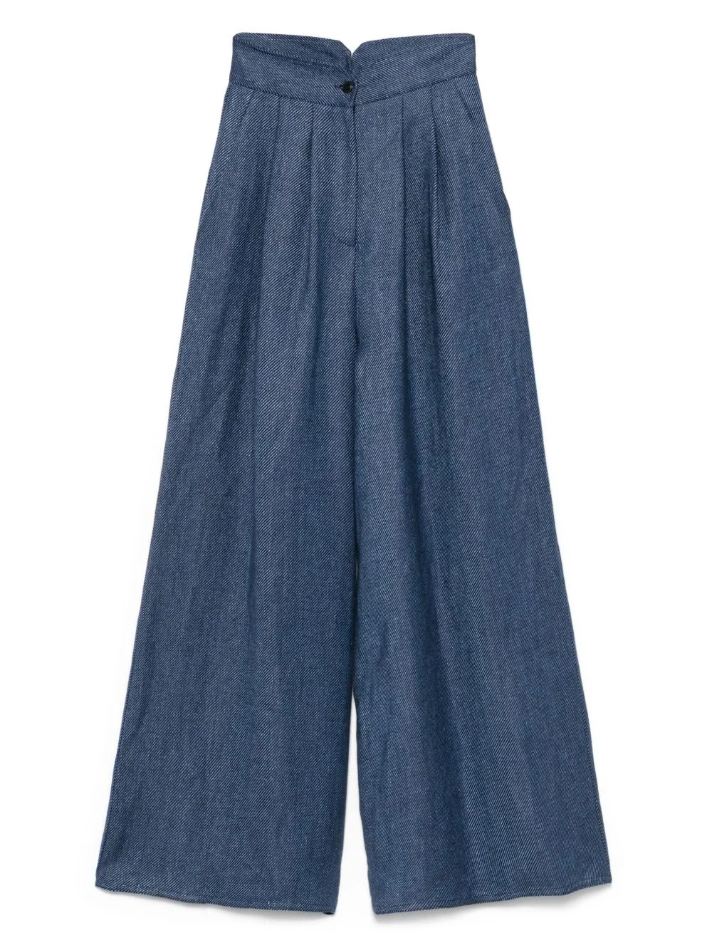 linen trousers Highlights - Indigo blue - Front button and zip fastening - Two side slash pockets - Pleat detailing Made in Italy Composition Linen/Flax 100% SIZE & FIT Model measurements Height 5 ft 10 in(1.78 m) Bust/Chest 31.49 in(80 cm) Hips 37 in(94 cm) Waist 23.62 in(60 cm) FittingInformation Designed with a wide-leg cut, these trousers allow for a close fit at the waist and offer a loose and roomy fit over the leg Made from a midweight non-stretch fabric