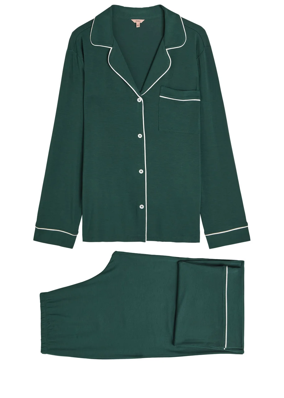Info & Care Eberjey jersey pyjama set Shirt: camp collar, chest patch pocket, piped trims, button fastenings through front Trousers: elasticated waist, piped trims, pull on; 95% modal, 5% spandex Machine wash Size & Fit Length shoulder to hem: 25 inches/ 63.5cm; Inside leg length: 31 inches/ 79cm; Midweight Relaxed fit Model is 5'10"/ 178cm and wears a size small