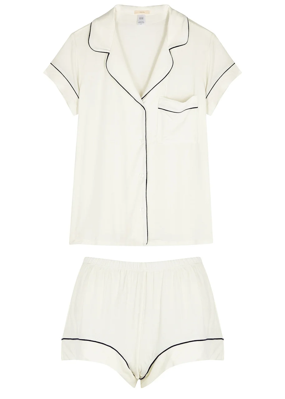 INFO & CARE - Eberjey jersey pyjama set - Shirt: camp collar chest patch pocket piping trims button fastenings through front - Shorts: elasticated waist piping trims pull on - 95% modal 5% spandex SIZE & FIT - Hand wash - Length shoulder to hem: 25.5 inches/ 64.5cm - Length waist to hem: 9 inches/ 23cm - Midweight - Relaxed fit - Model is 5'10"/ 178cm and wears a size small