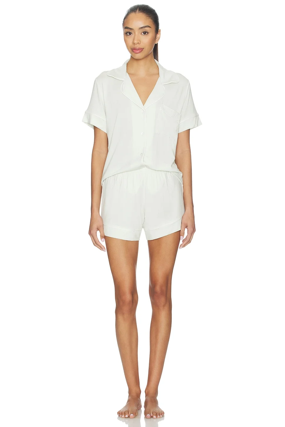 - 95% modal 5% elastane - Machine wash - Front button closure with pull-on styling - Elasticized waistband - Breast slip pocket - Notched lapel collar - Midweight jersey fabric - Sold as a set - Revolve Style No. EBER-WI1451 - Manufacturer Style No. PJ1018SN