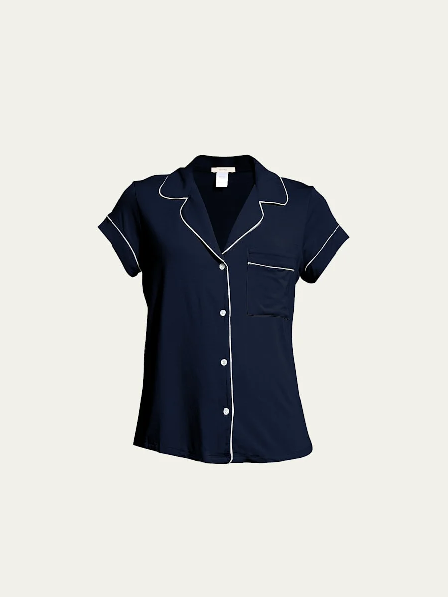 Eberjey "Gisele" twopiece jersey pajama set with contrast piping. Notched collar; button front. Short sleeves. Chest patch pocket. Straight hem. Includes matching boxer shorts with elasticized waistband. Modal/spandex. Imported.