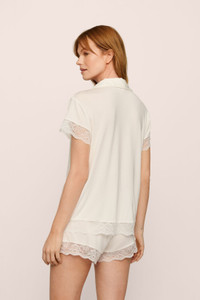 Romanticize your sleep. Made from TENCEL™ Modal fibers and a touch of elastane, this buttery soft fabric is verified by OEKO-TEX® Standard 100, meaning it’s dyed with safe and non-toxic dyes. This set features a short sleeve button front top with notch collar and a low-rise cheeky shot with an elastic waistband. This bridal-ready set pairs well with our Sherpa Slippers. Color: Ivory DESIGN & FIT Slim-fit short sleeve, button-front, notch collar, and lace trim -Shortie shorts with thin elastic waistband -Inseam: 2.5” -Slim Fit — tailored, close to the body for a sleek look- Low-rise cheeky shorts with elastic waistband FABRIC & CARE - 95% TENCEL™ Modal, 5% Elastane - Hand wash cold, lay flat to dry - Imported