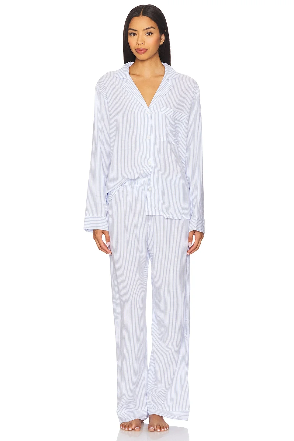 - 63% LENZING™ ECOVERO™ viscose 37% cotton - Machine wash - Front button closure and pull-on styling - Breast slip pocket - Elasticized waistband - Notched lapel collar - Midweight linen fabric - Sold as a set - Revolve Style No. EBER-WI1400 - Manufacturer Style No. PJ3030