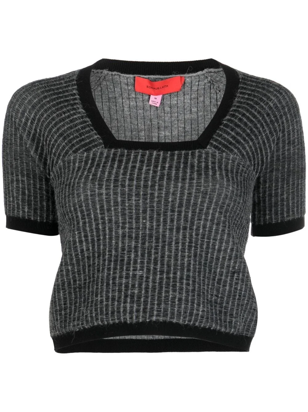 Amoretto cropped T-shirt Eckhaus Latta's Amoretto T-shirt is defined by its rib-knit construction. It’s rendered in a dark-grey hue traced with contrasting black trims, evocative of the brand’s bold aesthetic. Highlights - Anthracite grey/black - Alpaca wool-blend - Knitted construction - Fine ribbed - Square neck - Short sleeves - Contrasting trim - Cropped Imported Composition Nylon 38%, Alpaca Wool 26%, Acrylic 25%, Wool 10%, Spandex/Elastane 1% SIZE & FIT Model measurements Height 5 ft 10 in(1.79 m) Bust/Chest 31.1 in(79 cm) Hips 35.03 in(89 cm) Waist 24.01 in(61 cm) FittingInformation Designed for a slim fit that sits just away from the body offering a close yet comfortable fit Made with a lightweight knit, this piece offers some stretch This piece fits true to size – take your usual size