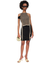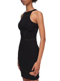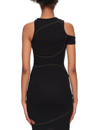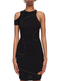 Eckhaus Latta dress in black, asymmetrical silhouette, sleeveless, cutouts at shoulder and upper thigh, curvilinear stitching throughout. Made in Portugal Standard Sizing. Composition: 90% Nylon, 10% Elastane. Model is 5ft 8” and wearing a size XS. Bust: 32” Waist: 25” Hip: 35"