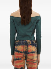 Bardot-neck corset blouse Highlights - Green - Off-the-shoulder neckline - Long sleeves - Corset-shaped - Fitted bodice Made in United States Composition Polyester 87%, Nylon 12%, Elastane 1% Washing instructions Read Manufacturer Guidelines
