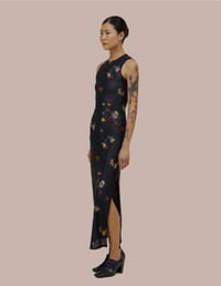 Slim fit, full length sleeveless dress with slit at left side seam. Made of double layer digitally printed micromesh. Each layer has a distinct all over print, creating depth and dimension. XXS: 51.5 front length, 8.25 waist, 10.5 chest XS: 53.5 front length, 10.25 waist, 12.5 chest S: 55.5 front length, 12.25 waist, 14.5 chest M: 57.5 front length, 14.25 waist, 16.5 chest L: 59.5 front length, 16.25 waist, 18.5 chest XL: 61.5 front length, 18.25 waist, 20.5 chest XXL: 63.5 front length, 20.25 waist, 22.5 chest May is 5'10" and wears a size S. 92% POLYESTER 8% SPANDEX Produced in China.