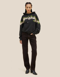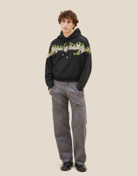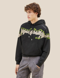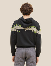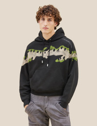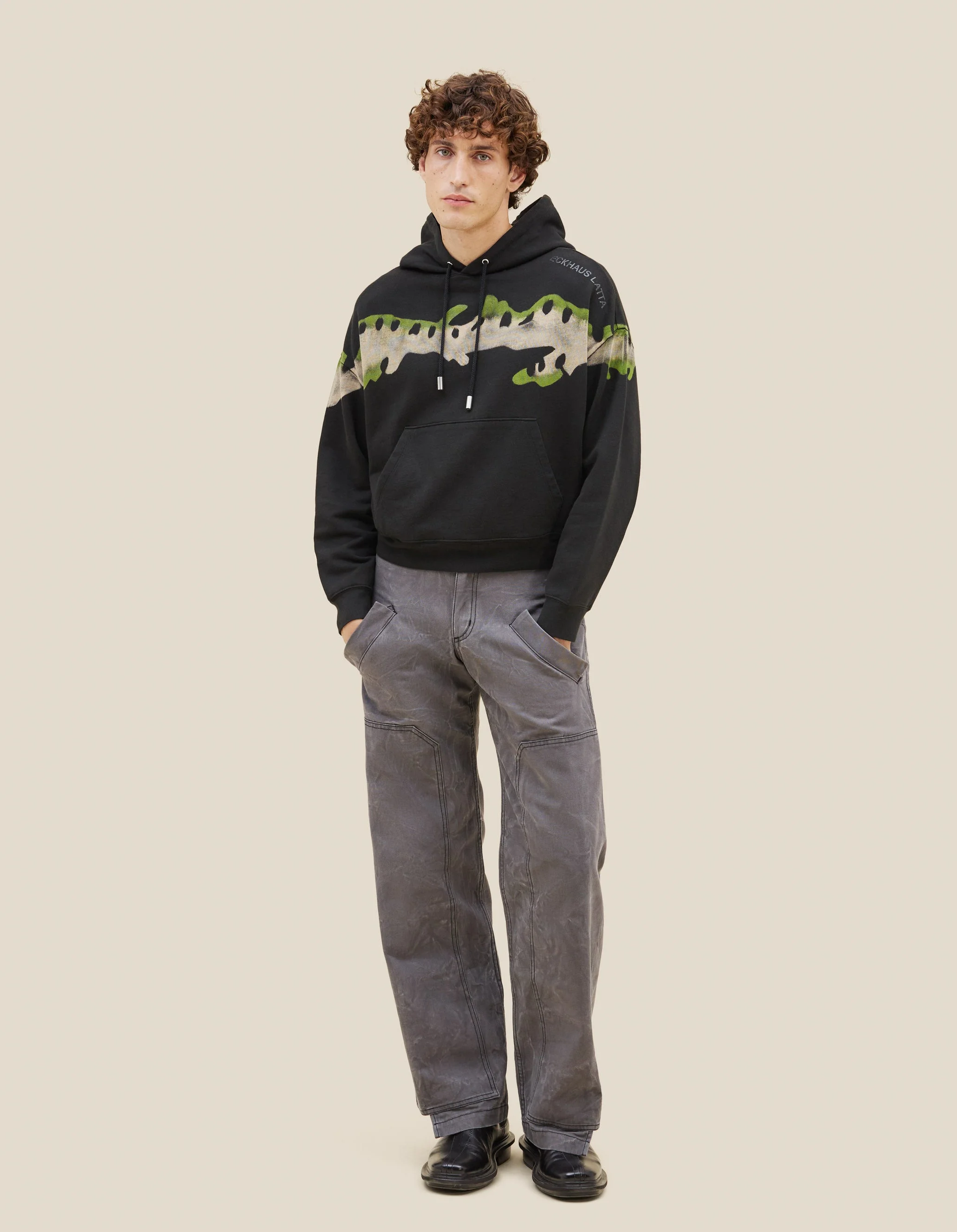 This piece is crafted from brushed French terry in a relaxed, cropped fit, garment-dyed black with an abstract design across the chest and sleeves, and finished with a glossy black logo on the shoulder.