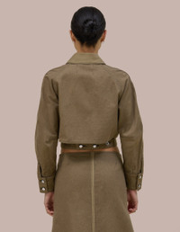 Relaxed, cropped fit in 9oz Japanese denim with raglan sleeves and a contrast collar. Features a button front closure and adjustable waist band. May is 5'10 and wears a size small 100% cotton Produced in USA.