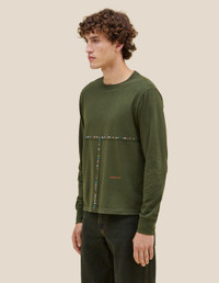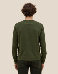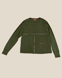 This top is made from Pima cotton jersey in a relaxed fit, featuring lapped raw-edged seams, garment-dyed green with metallic jewels applied along the front seams, and a red logo on the abdomen.