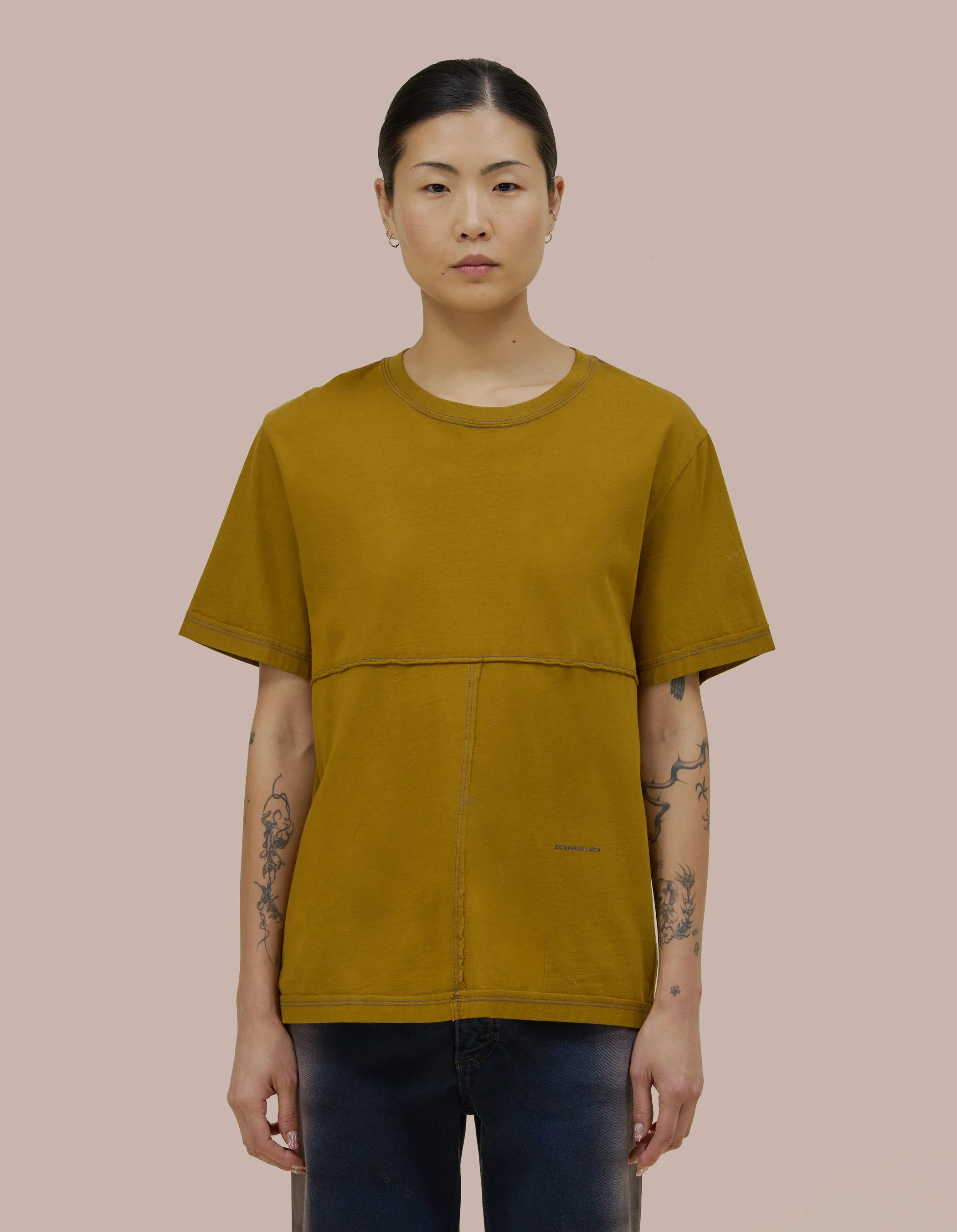 Our classic relaxed fit tee in Pima cotton jersey with lapped raw-edged seams. Garment dyed in solid olive green with ultramarine blue contrast topstitching. Finished with a screenprinted logo on the abdomen. Oliver is 6' and wears a size medium, May is 5'10 and wears a size medium 100% Cotton Produced in Peru.