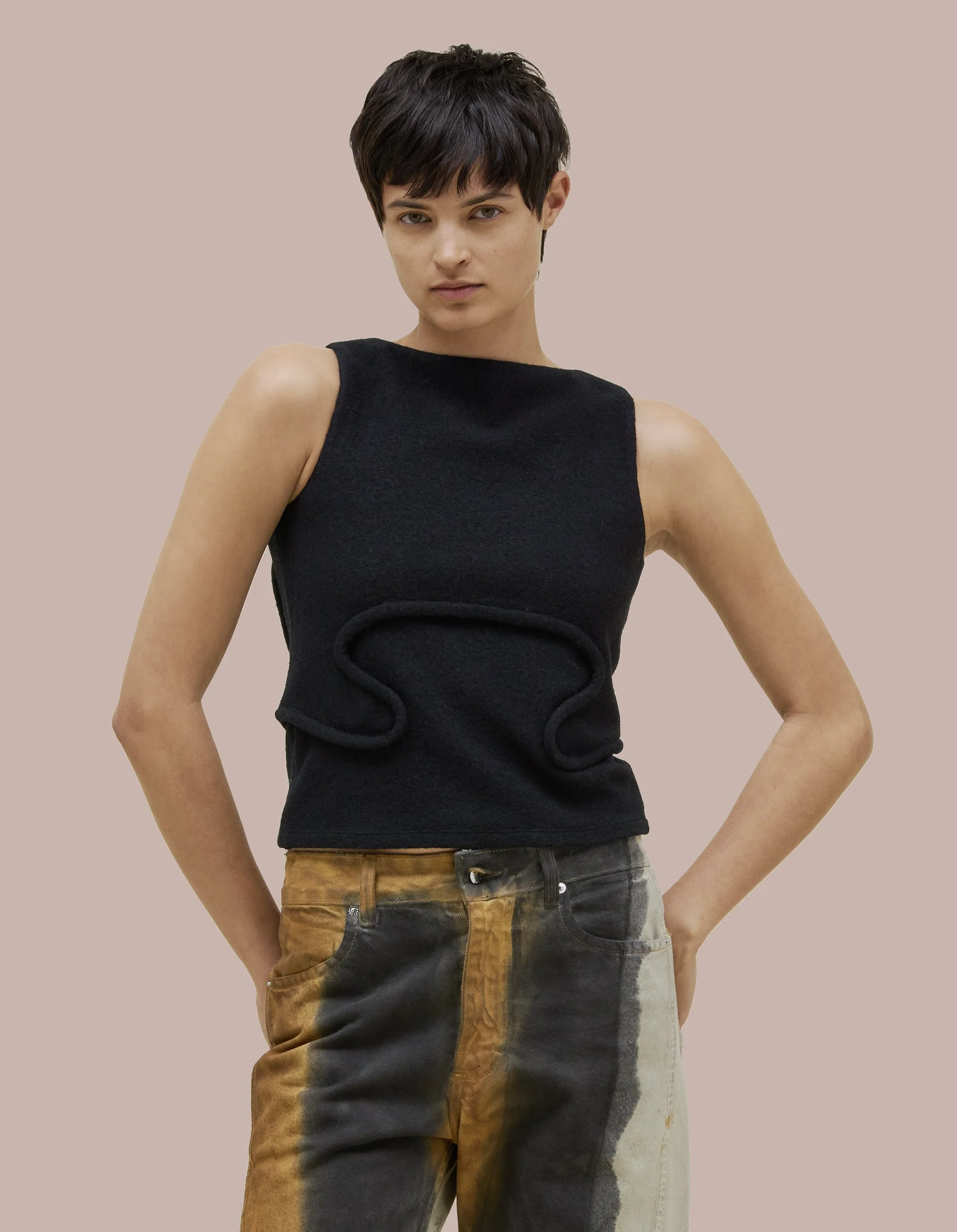 This tank features a boat neck with a boxy fit and bound curvilinear seams creating definition as they move across your body. Made from a boiled wool cotton blend. XS: 21.75 center front length, 16.25 chest width, 9 neck width seam S: 22.37 center front length, 17.25 chest width, 9.25 neck width seam M: 23 center front length, 18.25 chest width, 9.5 neck width seam L: 23.62 center front length, 19.25 chest width, 9.75 neck width seam XL: 24.25 center front length, 20.25 chest width, 10 neck width seam Model wears size small 53% WOOL 47% COTTON Produced in China.