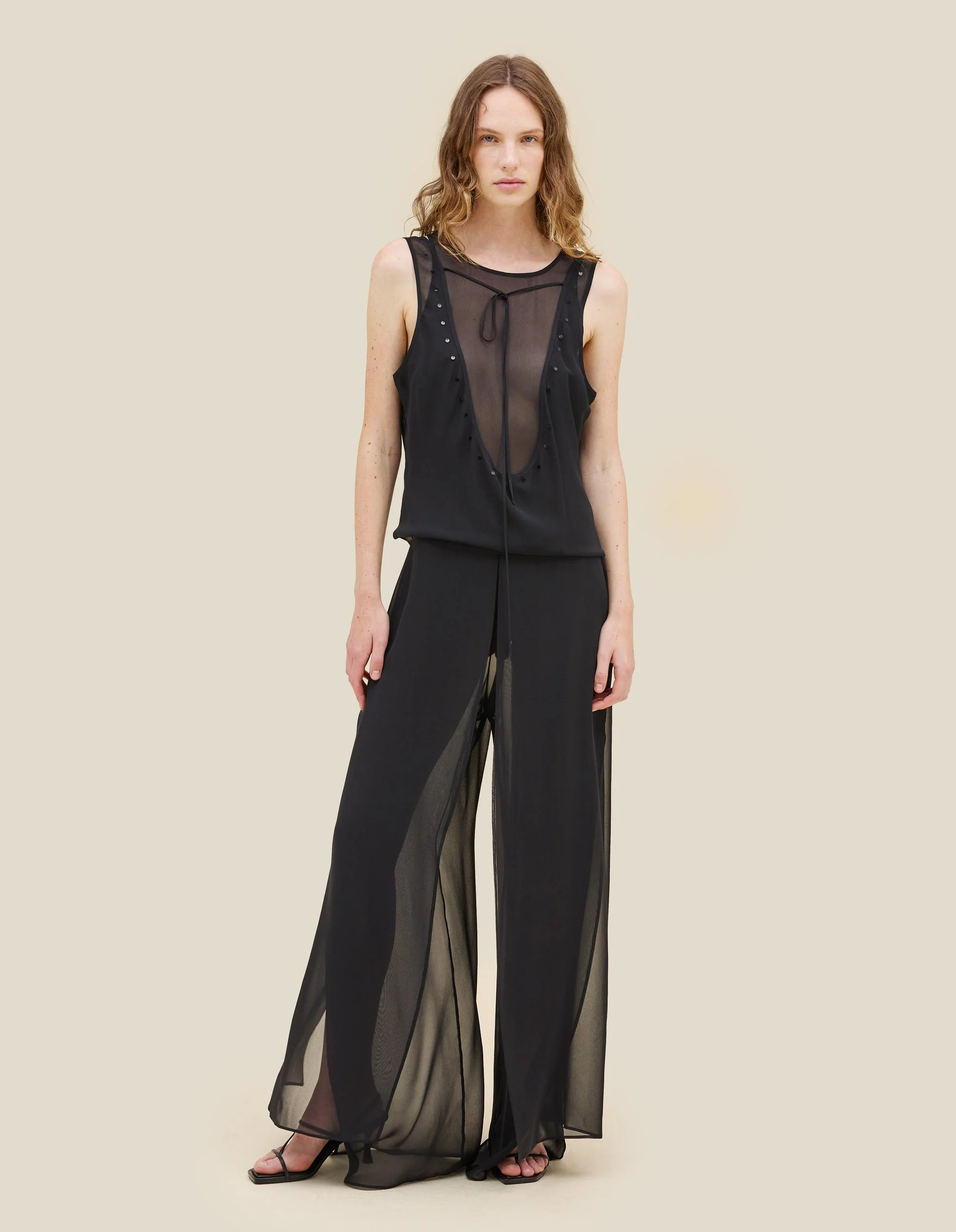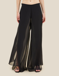 Double-layered pant in silk chiffon, featuring top-layer panels that kiss at the front and back, straight legs with a side-seam slit, an optional apron skirt overlay, and a center-back invisible zipper. Model wears a size Small 100% Silk Produced in China