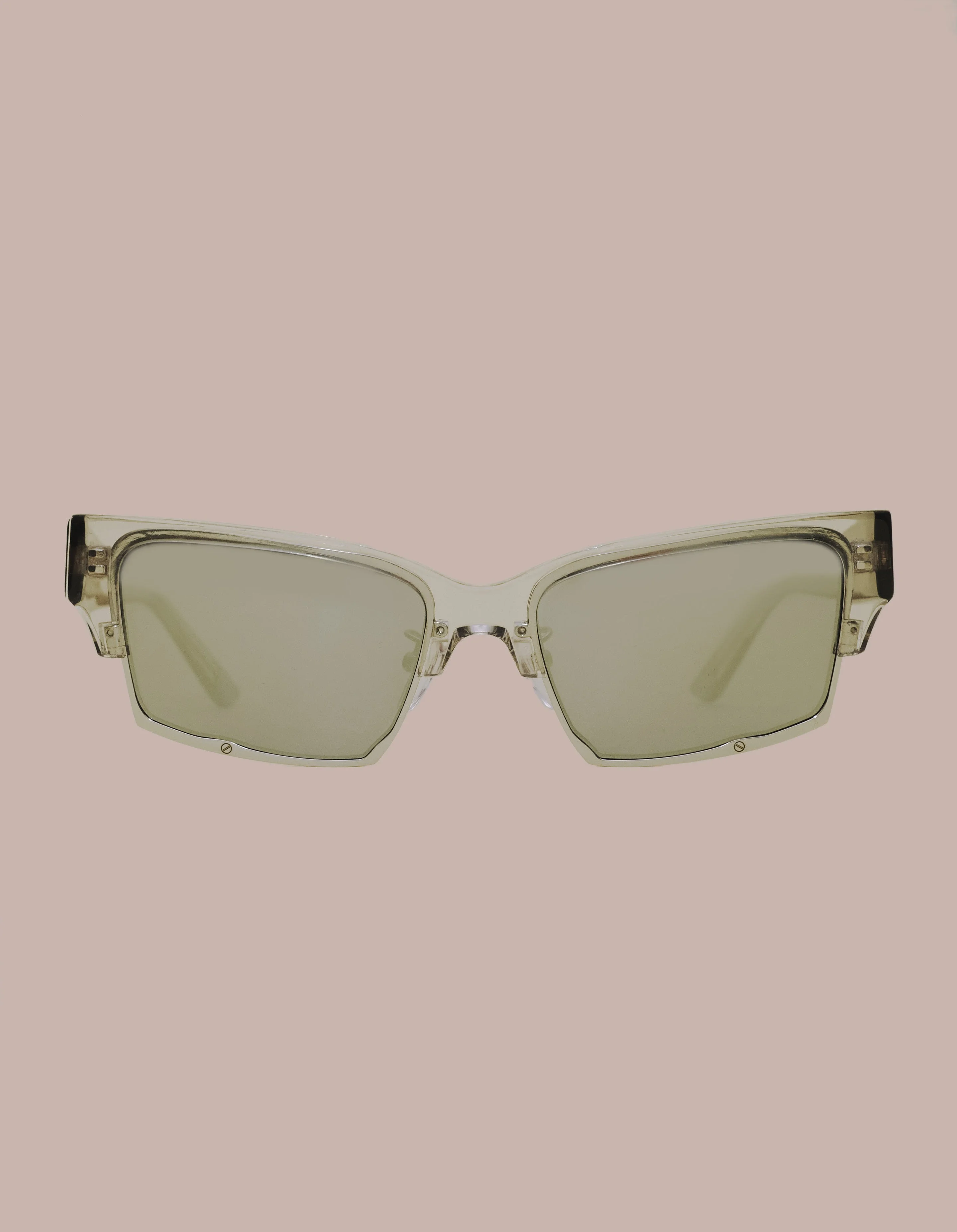 Unique take on the browline silhouette with angular acetate. Clear frame contrasted with the organic lens shape in mirrored Silver tint. Laminated acetate patchwork temples and embedded silver logo. Handcrafted from bio-circular acetate (recycled plastics). Five barrel hinges with coated ‘safety’ screws. Complete with lens cloth and collapsible pyramid case. Lens cloth made with 100% recycled PET microfiber with custom artwork. Pyramid case made with 100% recycled leather-like PET black case with plush flocked lining and embossed custom branding. Produced in China.