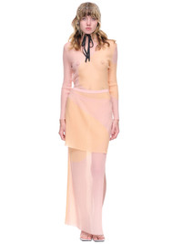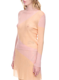 ECKHAUS LATTA top in pink, fine gauge knit, micro-pleats design, Intarsia color-work, semi-sheer, seamless turtleneck, long sleeves, lightweight, slim fit. Made in Italy Standard Sizing 70% Polyamide, 30% Polyester Model is 5'9" wearing size S. Bust: 32" Waist: 24" Hip: 34"