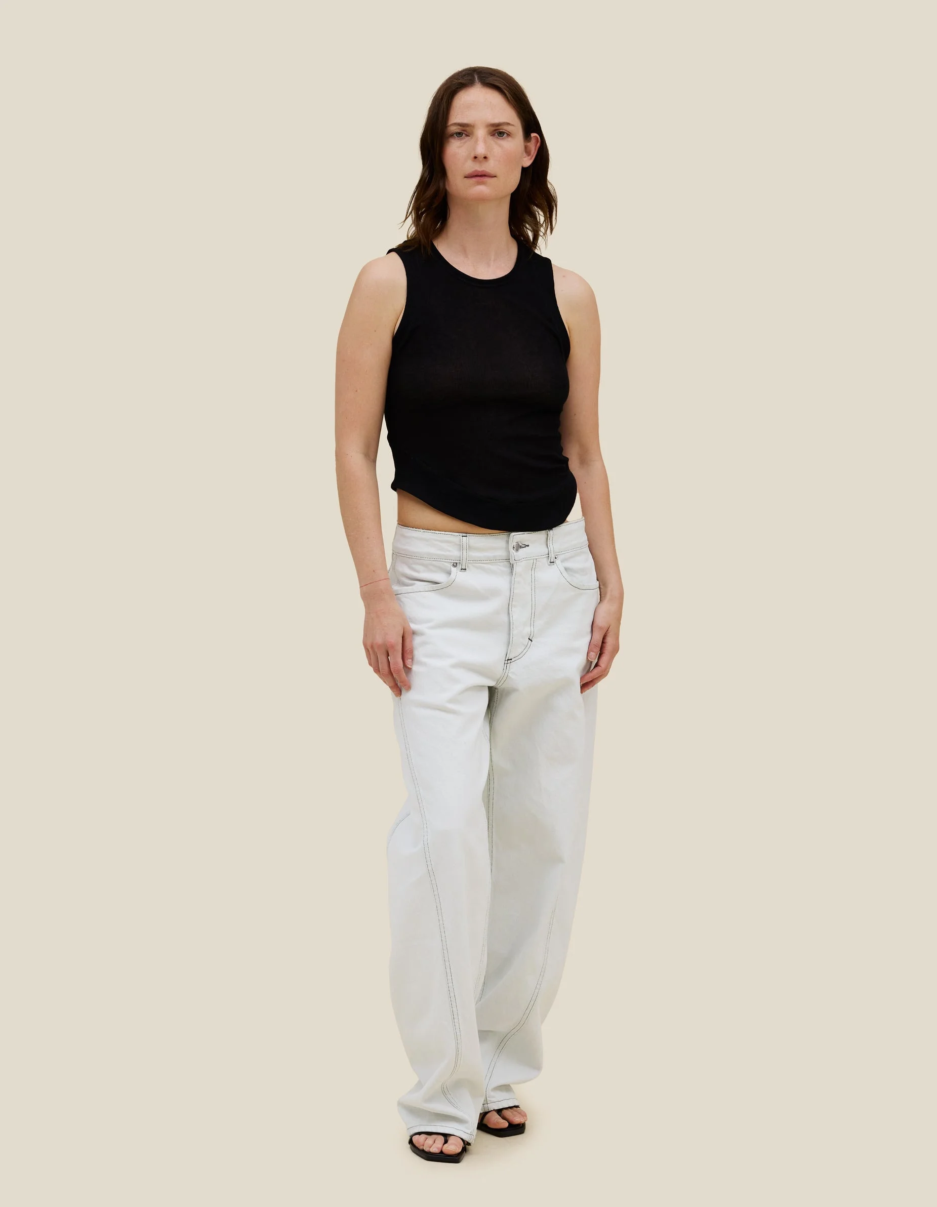 Tank top in fine-gauge Japanese cotton/nylon rib, featuring asymmetrical details and a curvilinear hem.