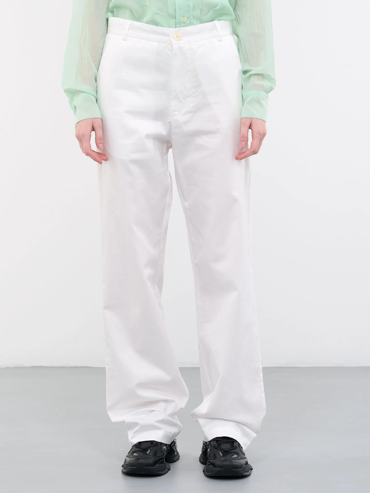 EDWARD CUMING pants in white, cotton twill, mid-waist, belt loops, button & zip-fly fastening, four pocket styling, straight leg, regular fit. Made in Spain US Sizing 100% Cotton Model is 5'10" wearing size 1. Bust: 32" Waist: 24" Hips: 35"