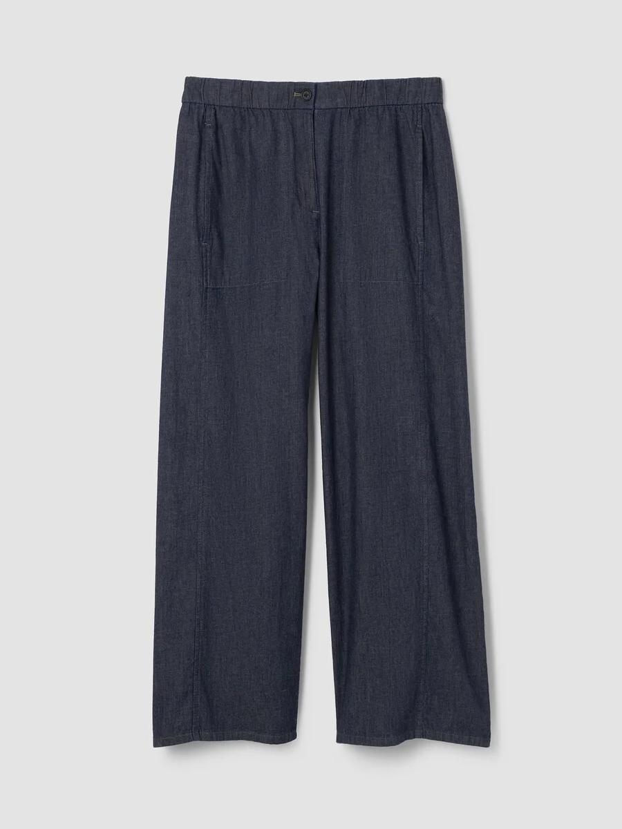 Lighter than denim. Our relaxed wide-leg pant updated with a fly front closure. Soft and drapey, in indigo-dyed organic cotton. Made in a Fair Trade Certified™ factory. Style No. S5PGG-P4701 DESIGN - Slim through the hips, wider through the leg. Fits the body with ease. - 1 1/2-inch elastic waistband, zipper fly front with corozo button closure. - On-seam pockets. - 11-inch rise; 28 1/2-inch inseam; 11-inch leg opening (size XS). 11-inch rise; 26 1/2-inch inseam; 10-inch leg opening (size PS). 13-inch rise; 27 1/2-inch inseam; 12-inch leg opening (size 1X). - Style No. S5PGG-P4701 FABRIC - Inspired by chambray. An indigo-dyed twill that transitions from season to season. Soft, light and fluid. - Machine wash cold. Tumble dry low. Do not dry clean. - Dye may transfer. Use care when wearing. - Made in Indonesia. 100% Organic Cotton. SUSTAINABILITY - Our Fair Trade Certified™ factories meet rigorous social and environmental standards. By choosing Fair Trade Certified™ products, you’re helping to improve the lives of workers, build resilient communities and protect the environment. - Organic farming supports clean water and healthy soil.
