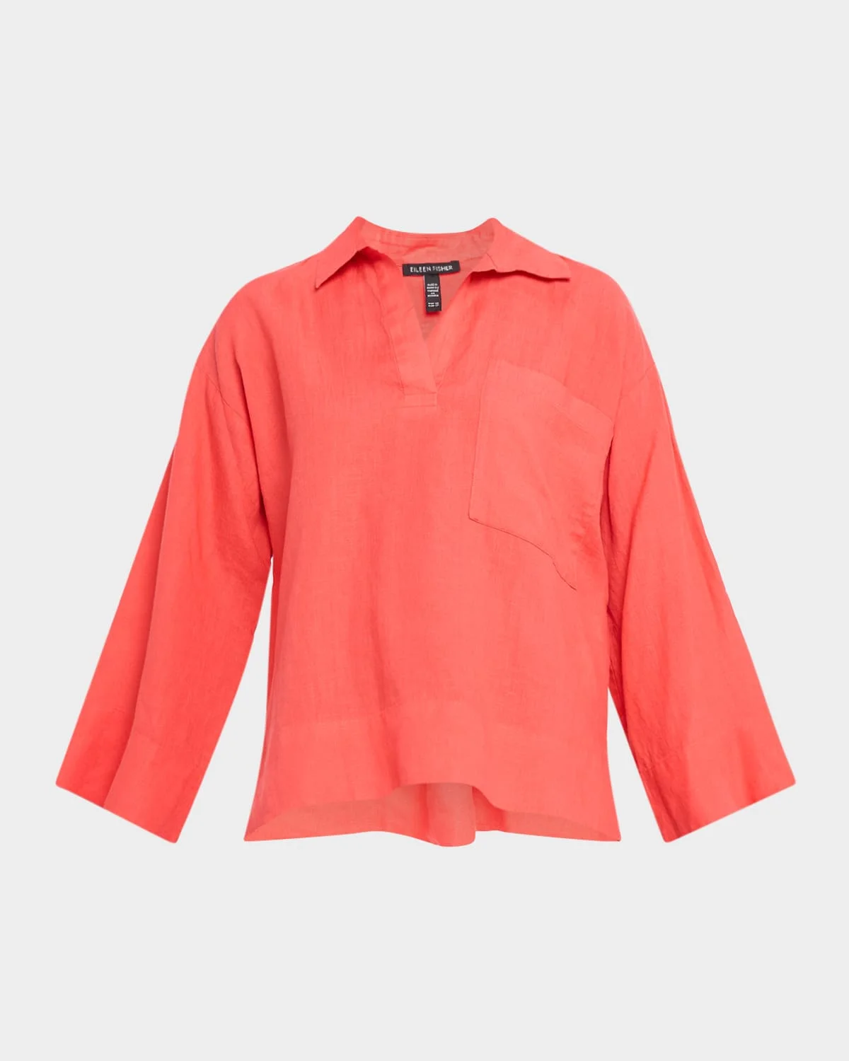 The breezy shirt from Eileen Fisher is crafted of light and airy organic linen, designed with a generous boxy fit that drapes away from the body Approx. 25"L from shoulder to hem V neckline with spread collar Drop shoulders Long sleeves Chest patch pocket Back inverted pleat Hem side slits Boxy fit Organic linen Machine wash cold Imported SIZE & FITModel measurements: 5 & apos;10" tallModel is wearing a US size 4/Small