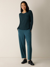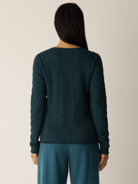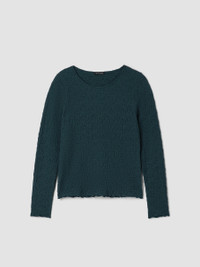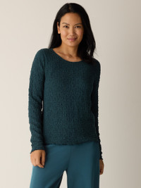 Soft and substantial, with plenty of texture. The round neck top with long sleeves, in our bouncy new Bubble Jacquard. Style No. F5KSE-T6372 DESIGN - Our closest fit, designed to hug the body. With stretch for maximum comfort. - Only available at select EILEEN FISHER stores. - Kalyane is 5'10" and wears a size S, which measures 23 1/2 inches on the body. - Lettuce edge at the hem. - Style No. F5KSE-T6372 FABRIC - An intricate knit with substance and stretch. In a textural blend of soft cotton and recycled polyester—dress it up, dress it down. - Machine wash cold. Tumble dry low. May snag on jewelry. - Made in Vietnam. 55% Organic Cotton/44% Recycled Nylon/1% Spandex. SUSTAINABILITY - Recycled nylon keeps waste out of the landfill. It's part of our commitment to changing the way clothes are made.