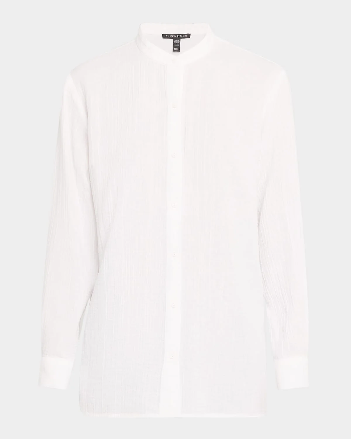 Eileen Fisher shirt in rippled organic cotton, garment washed for a livedin feel Approx. 29"L from shoulders to hem Band collar; button front Long sleeves; button cuffs Boxpleated back yoke Hem side slits Relaxed fit Organic cotton Machine wash cold Imported
