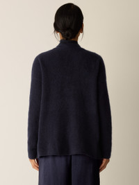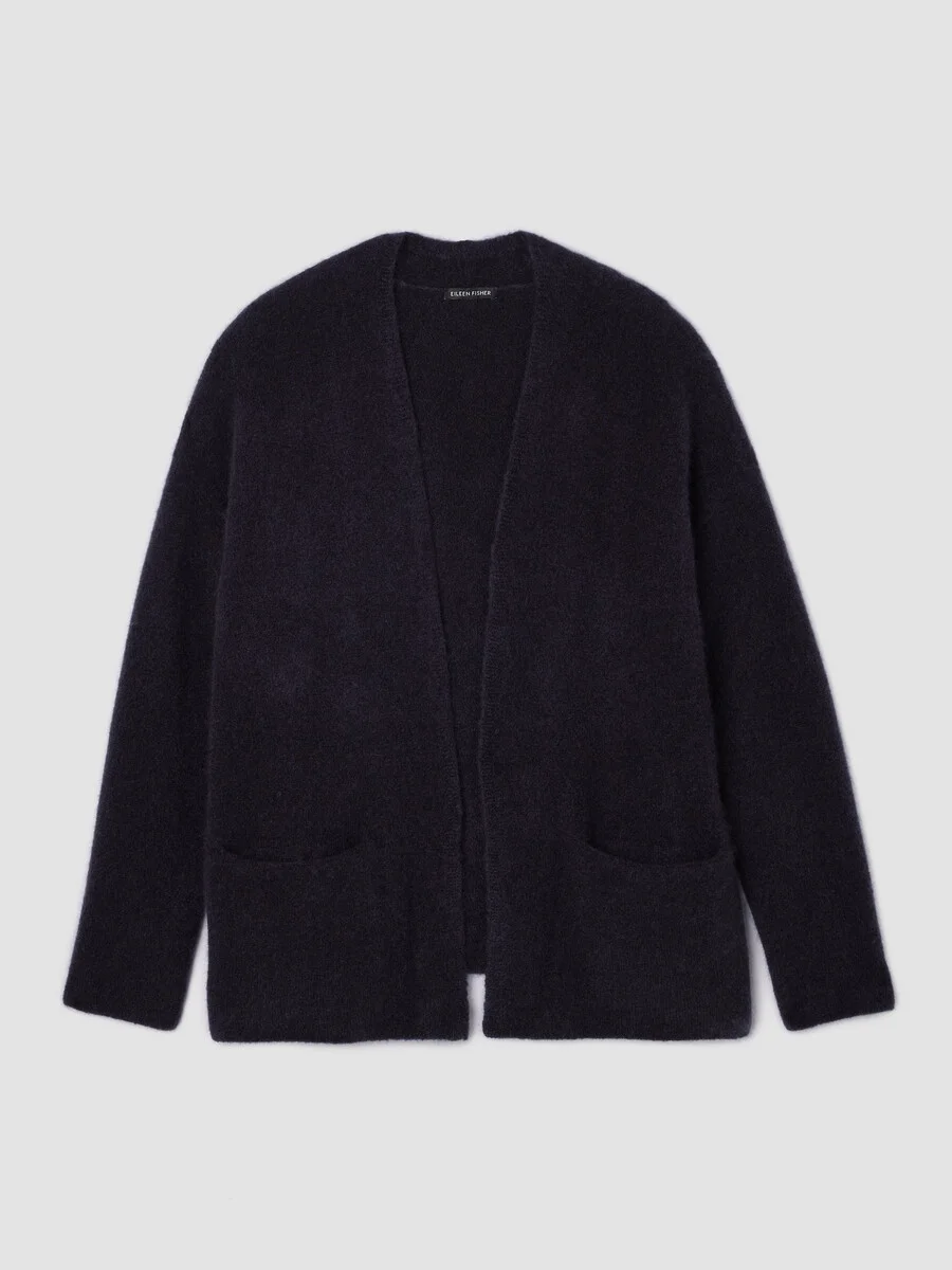 Blissfully soft. A long cardigan with a high collar and open front. In a textural blend of cashmere and silk—one of our softest and most luxurious yarns. Style No. F5MPS-K5447 DESIGN - Designed with a generous, boxy fit that drapes away from the body to create movement. - Black cardigan only available online and in our LAB store. - Kalyane is 5'10" and wears a size S in Ink, which measures 24 1/2 inches on the body. Size PS measures 23 inches on the body. Size 1X measures 27 1/2 inches on the body. - High neck, open front, drop shoulder. - Front knit-in pockets. - Style No. F5MPS-K5447 FABRIC - One of our softest yarns, an Italian boucle with textural poufs of cashmere and silk. - Hand wash cold. Do not wring. Reshape and lay flat to dry. May snag on jewelry. - Made in Romania. 72% Cashmere/17% Silk/10% Recycled Nylon/1% Elastane. SUSTAINABILITY - This fiber is certified to the Sustainable Fibre Alliance Cashmere Standard and is produced in a way that protects animal welfare and promotes safe working conditions.