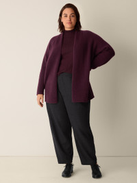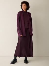 Blissfully soft. A long cardigan with a high collar and open front. In a textural blend of cashmere and silk—one of our softest and most luxurious yarns. Style No. F5MPS-K5444 DESIGN - Designed with a generous, boxy fit that drapes away from the body to create movement. - Oat cardigan only available online. - Jisu is 5'9" and wears a size XS, which measures 27 1/2 inches on the body. Size 1X measures 30 1/2 inches on the body. - Open front, raglan sleeves. - Style No. F5MPS-K5444 FABRIC - One of our softest yarns, an Italian boucle with textural poufs of cashmere and silk. - Hand wash cold. Reshape and lay flat to dry. May snag on jewelry. - Made in Romania. 72% Cashmere/17%Silk/10% Recycled Nylon/1% Elastane SUSTAINABILITY - This fiber is certified to the Sustainable Fibre Alliance Cashmere Standard and is produced in a way that protects animal welfare and promotes safe working conditions.