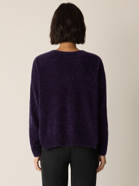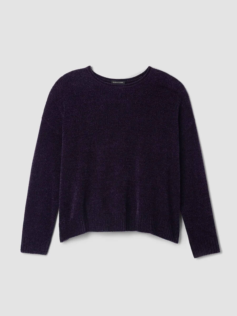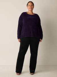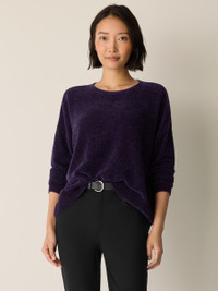 Cozy and effortless. The crew neck top in a velvety chenille blend made with Tencel™ Lyocell. Style No. F5CED-W5164 DESIGN - Designed with a generous, boxy fit that drapes away from the body to create movement. - Jisu is 5'9" and wears a size S in Aubergine, which measures 23 1/2 inches on the body. Size 1X measures 26 inches on the body. - Crew neck, drop shoulder, rolled edge at the neck. - Finished with ribbed trim at the hem and cuffs. - Style No. F5CED-W5164 FABRIC - Velvety texture that drapes and moves, with a touch of cotton for softness. - Made in Cambodia. 74% Tencel Lyocell™/26% Organic Cotton. SUSTAINABILITY - Tencel™ Lyocell is made from responsibly harvested trees.