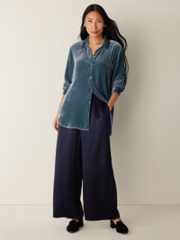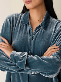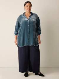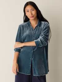 Polished, day or night. A classic collar shirt with side slits, in our shimmery washable velvet. Made in a Fair Trade Certified™ factory. Style No. F5VLO-T6368 DESIGN - Close at the shoulders, wider at the hem. A silhouette that fits the body with ease. - Bo Bay is 5'9" and wears a size XS in Sea Spray, which measures 28 1/2 inches in front and 29 1/2 inches in back. Size PS measures 27 inches in front and 28 inches in back. Size 1X measures 31 1/2 inches in front and 32 1/2 inches in back. - Classic collar, curved hem. - Button front, button cuffs with double pleat. - Back yoke seam, center back box pleat. - Mother-of-pearl buttons. - Style No. F5VLO-T6368 FABRIC - Our signature viscose silk velvet, now made in part from pulp derived from recycled cotton. - Machine wash cold. Tumble dry low. Do not dry clean. - Made in Indonesia. 80% Viscose/20% Silk. SUSTAINABILITY - Our Fair Trade Certified™ factories meet rigorous social and environmental standards. By choosing Fair Trade Certified™ products, you’re helping to improve the lives of workers, build resilient communities and protect the environment. - This fabric is bluesign® APPROVED. It's dyed with safer chemistry using less water and less energy, meeting the bluesign® CRITERIA.