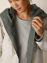 Wear it one day, reverse it the next. A versatile hooded coat with a button front, in a cotton nylon weave with subtle sheen. Style No. S6OFQ-C0506 DESIGN - Close at the shoulders, wider at the hem. A silhouette that fits the body with ease. - Select colors may vary by store. - Kalyane is 5'10" and wears a size S, which measures 36 inches on the body. Size 1X measures 37 1/2 inches on the body. - Hood, button front with corozo buttons. - Patch pockets. - Style No. S6OFQ-C0506 FABRIC - Our choice for outerwear. A fine weave with a sophisticated sheen, now made with nylon that's been recycled from discarded fishing nets. - Machine wash cold. Line dry. - Made in Indonesia. 97% Organic Cotton.3% Spandex. SUSTAINABILITY - Recycled nylon keeps waste out of the landfill. It's part of our commitment to changing the way clothes are made.