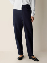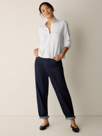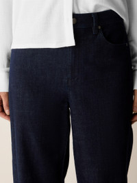 Our best-selling lantern pant. A modern shape with a sculpted hem, in our classic-weight denim with a touch of stretch. Made in a Fair Trade Certified™ factory. Style No. S6BDE-P4887 DESIGN - Subtly curved through the leg, slightly tapered at the ankle. Fits the body with ease. - Kalyane is 5'10" and wears a size S in Deep Indigo. Haejin is 5'5" and wears a size PS. Ryan is 5'8" and wears a size 1X. - 5-pocket styling, fly front with button and zipper closure. - Belt loops. - 11-inch rise; 28-inch inseam; 7-inch leg opening (size S). 10-inch rise; 26-inch inseam; 7-inch leg opening (size PS). 13-inch rise; 28-inch inseam; 8-inch leg opening (size 1X). - Style No. S6BDE-P4887 FABRIC - An update to our classic-weight denim. We blended organic and recycled cotton, and added a touch of stretch for comfort. - Machine wash cold. Tumble dry low. Color tranfer may occur. - Made in Indonesia. 78% Organic Cotton/20% Recycled Cotton/2% Elastane. SUSTAINABILITY - Our Fair Trade Certified™ factories meet rigorous social and environmental standards. By choosing Fair Trade Certified™ products, you’re helping to improve the lives of workers, build resilient communities and protect the environment. - Organic farming supports clean water and healthy soil.