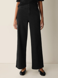 A sophisticated take on denim. The wide-leg trouser with a fly front and pockets, in a blend of organic and recycled cotton. Made in a Fair Trade Certified™ factory. Style No. S6BDE-P4901 DESIGN - Slim through the hips, wider through the leg. Fits the body with ease. - Drew is 5'9" and wears a size XS in Black. Haejin is 5'5" and wears a size PS. Ryan is 5'8" and wears a size 1X. - 3-inch waistband, fly front with hook and bar closure. - Front on-seam pockets, back patch pockets. - 11-inch rise; 29 1/2-inch inseam; 11-inch leg opening (size S). 11-inch rise; 27 1/2-inch inseam; 10 1/2-inch leg opening (size PS). 13-inch rise; 29 1/2-inch inseam; 12-inch leg opening (size 1X). - Style No. S6BDE-P4901 FABRIC - An update to our classic-weight denim. We blended organic and recycled cotton, and added a touch of stretch for comfort. - Machine wash cold. Tumble dry low. Color tranfer may occur. - Made in Indonesia. 78% Organic Cotton/20% Recycled Cotton/2% Elastane. SUSTAINABILITY - Our Fair Trade Certified™ factories meet rigorous social and environmental standards. By choosing Fair Trade Certified™ products, you’re helping to improve the lives of workers, build resilient communities and protect the environment. - Organic farming supports clean water and healthy soil.