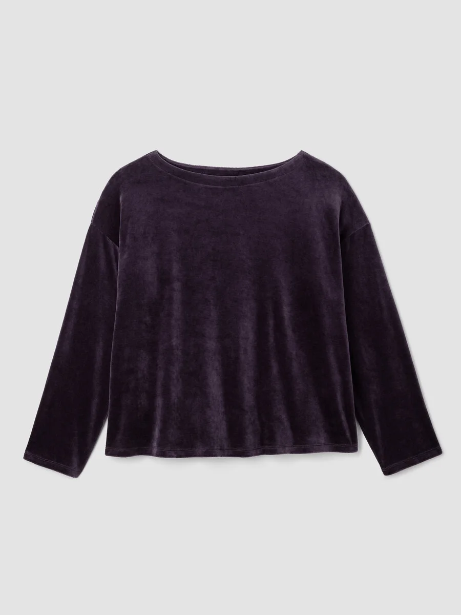 Easy and elevated. An effortless bateau neck top, transformed by the plush texture of our velvety velour. Pair it with our matching pant to make it a set. Style No. F5OET-T6360 DESIGN - A generous, boxy fit that drapes away from the body to create movement. - Select colors may vary by store. Lunette only available online. - Valerie is 5'9" and wears a size XS in Lunette, which measures 24 inches on the body. Size 1X measures 26 1/2 inches on the body. - Bateau neck, drop shoulder. - Style No. F5OET-T6360 FABRIC - Plush and cozy. Our velour knit is velvety smooth with a hint of luster—and the elevated feel that comes from blending soft cotton with Tencel™ Lyocell. - Machine wash cold. Tumble dry low. - Made in Vietnam. 60% Organic Cotton/40% Tencel™ Lyocell. SUSTAINABILITY - Tencel™ Lyocell fiber is made from responsibly harvested trees.