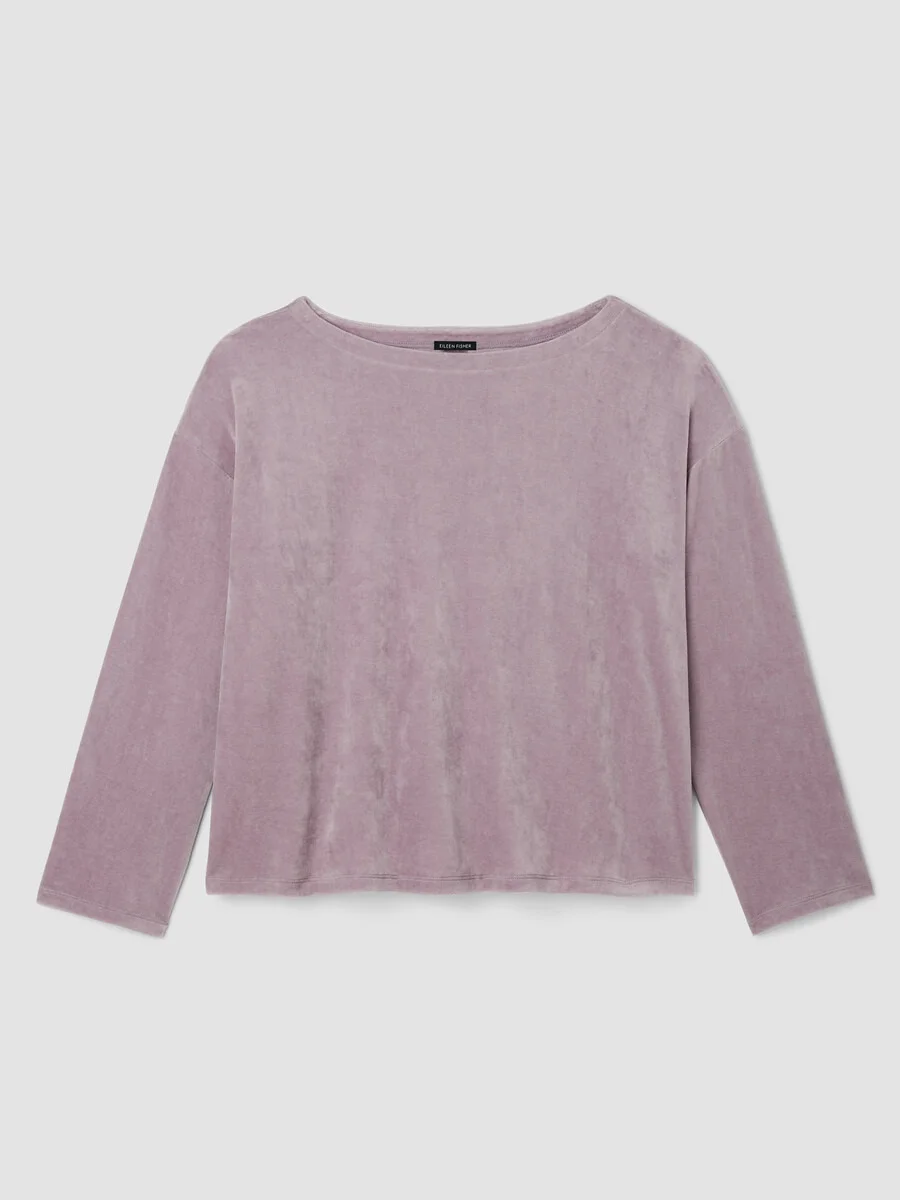 Easy and elevated. An effortless bateau neck top, transformed by the plush texture of our velvety velour. Pair it with our matching pant to make it a set. Style No. F5OET-T6360 DESIGN - A generous, boxy fit that drapes away from the body to create movement. - Select colors may vary by store. Lunette only available online. - Valerie is 5'9" and wears a size XS in Lunette, which measures 24 inches on the body. Size 1X measures 26 1/2 inches on the body. - Bateau neck, drop shoulder. - Style No. F5OET-T6360 FABRIC - Plush and cozy. Our velour knit is velvety smooth with a hint of luster—and the elevated feel that comes from blending soft cotton with Tencel™ Lyocell. - Machine wash cold. Tumble dry low. - Made in Vietnam. 60% Organic Cotton/40% Tencel™ Lyocell. SUSTAINABILITY - Tencel™ Lyocell fiber is made from responsibly harvested trees.