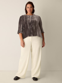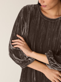 Easy and elevated. The round neck top with subtly gathered sleeves, in plush velvet with allover crushed texture. Made in a Fair Trade Certified™ factory. Style No. F5OVX-T6395 DESIGN - Close at the shoulders, wider at the hem. A silhouette that fits the body with ease. - Only available online and in our LAB store. - Bo Bay is 5'9" and wears a size XS in Rye, which measures 23 inches on the body. Size 1X measures 25 1/2 inches on the body. - Round neck, back keyhole closure with mother-of-pearl button. - Subtle shirring at the arms, elastic at the cuffs. - Style No. F5OVX-T6395 FABRIC - Our signature viscose silk velvet, with allover crushed texture. Now made in part from pulp from recycled cotton. - Dry clean only. - Made in Indonesia. 80% Viscose/20% Silk. SUSTAINABILITY - Our Fair Trade Certified™ factories meet rigorous social and environmental standards. By choosing Fair Trade Certified™ products, you’re helping to improve the lives of workers, build resilient communities and protect the environment. - This fabric is bluesign® APPROVED. It's dyed with safer chemistry using less water and less energy, meeting the bluesign® CRITERIA.
