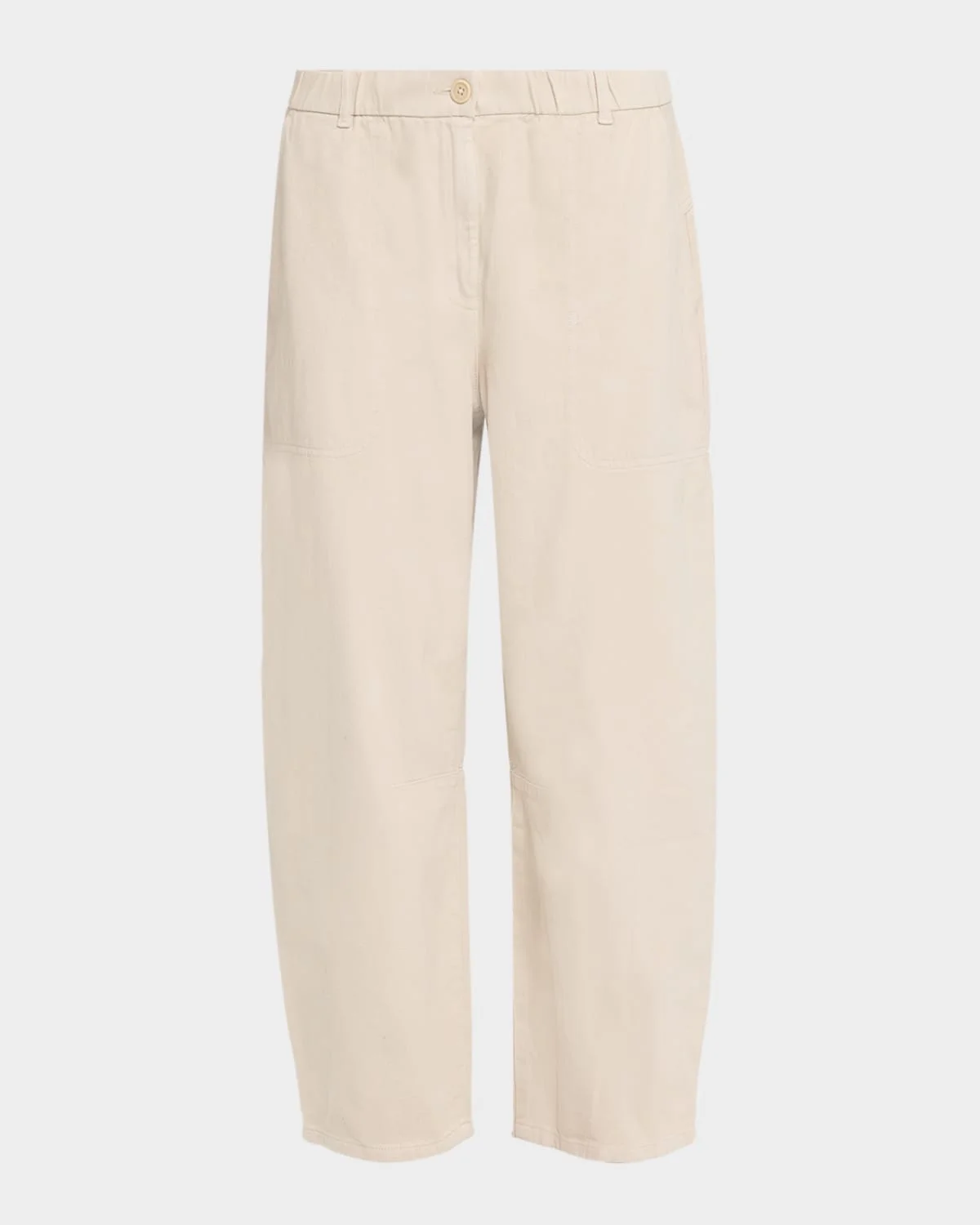These Eileen Fisher pants are crafted from an & nbsp;organic cotton blend in the comfortably relaxed lantern fit, featuring a subtle curve and slight taper at the ankle Mid-rise sits high on the hips Elasticized waistband Side slant pockets Cropped at the ankle Wide, tapered legs Button/zip fly; belt loops Organic cotton/spandex Machine wash cold Imported SIZE & FITModel measurements: 5 & apos;10" tallModel is wearing a US size 4/Small