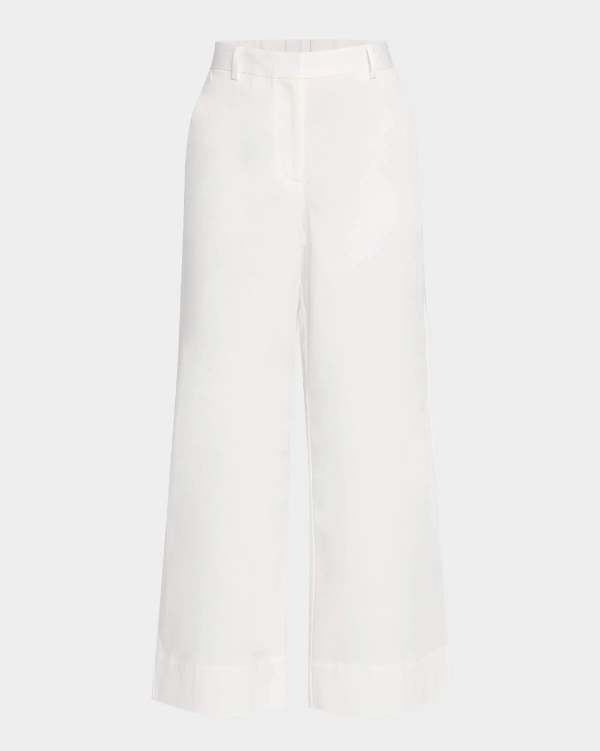 Eileen Fisher trousers in stretch organic cotton twill Approx. 27.5" inseam Midrise sits high on the hips Flat front Side slant pockets Back welt pockets Cropped at the ankle Wide legs Button/zip fly; belt loops Organic cotton/elastane Machine wash cold Made in Portugal