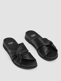 An elevated slide sandal with a unique twist detail. In soft Nappa leather with a comfortable molded footbed. Style No. EF50027B DESIGN - Rubber outsole made in part with recycled rubber for comfort, flexibility and traction. - Only available at select EILEEN FISHER stores. - 1-inch platform, leather-covered wedge heel. - Open toe, slip-on construction with twist detail at upper band. - Molded footbed and padded toe, arch and heel for comfort; leather-lined insole. - Padded toe, arch support and heel for comfort; leather-lined insole. - Style No. EF50027B FABRIC - Nappa leather upper. - Made in China. SUSTAINABILITY - Leather upper and insole lining finished at an LWG Gold-Rated Tannery.