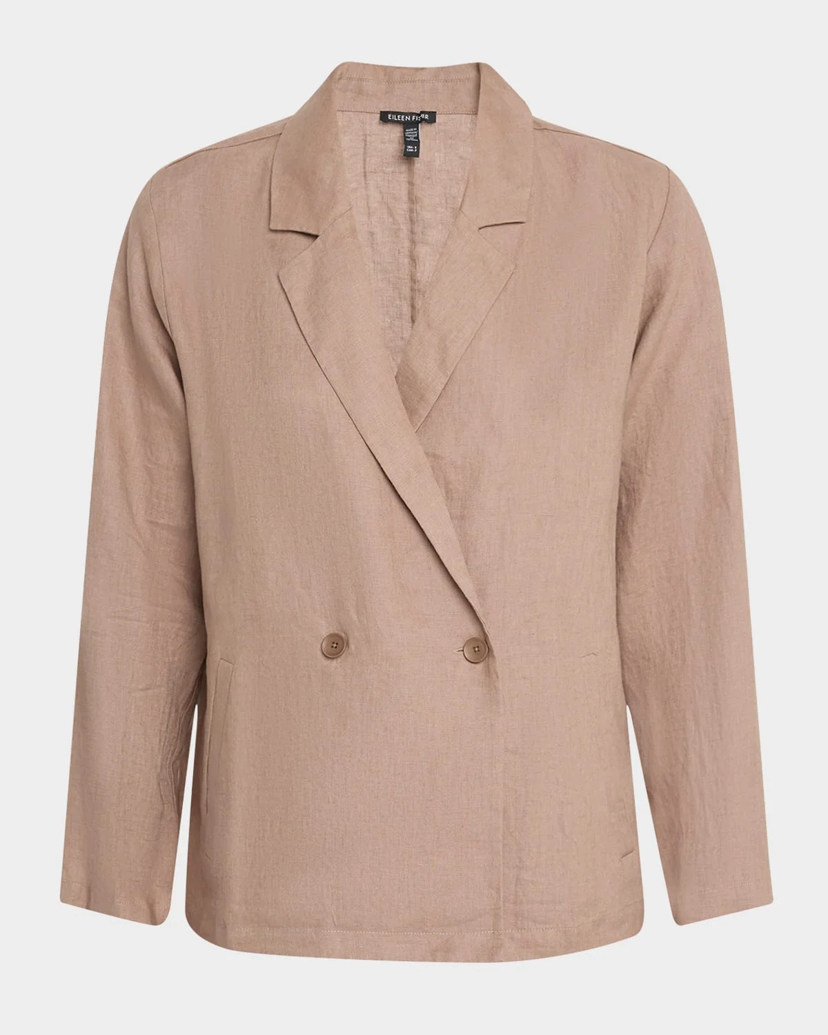 Eileen Fisher blazer in mediumweight organic linen Approx. 27"L from shoulders to hem Notched lapel; doublebreasted front Long sleeves Side welt pockets Relaxed fit Organic linen Machine wash cold Imported