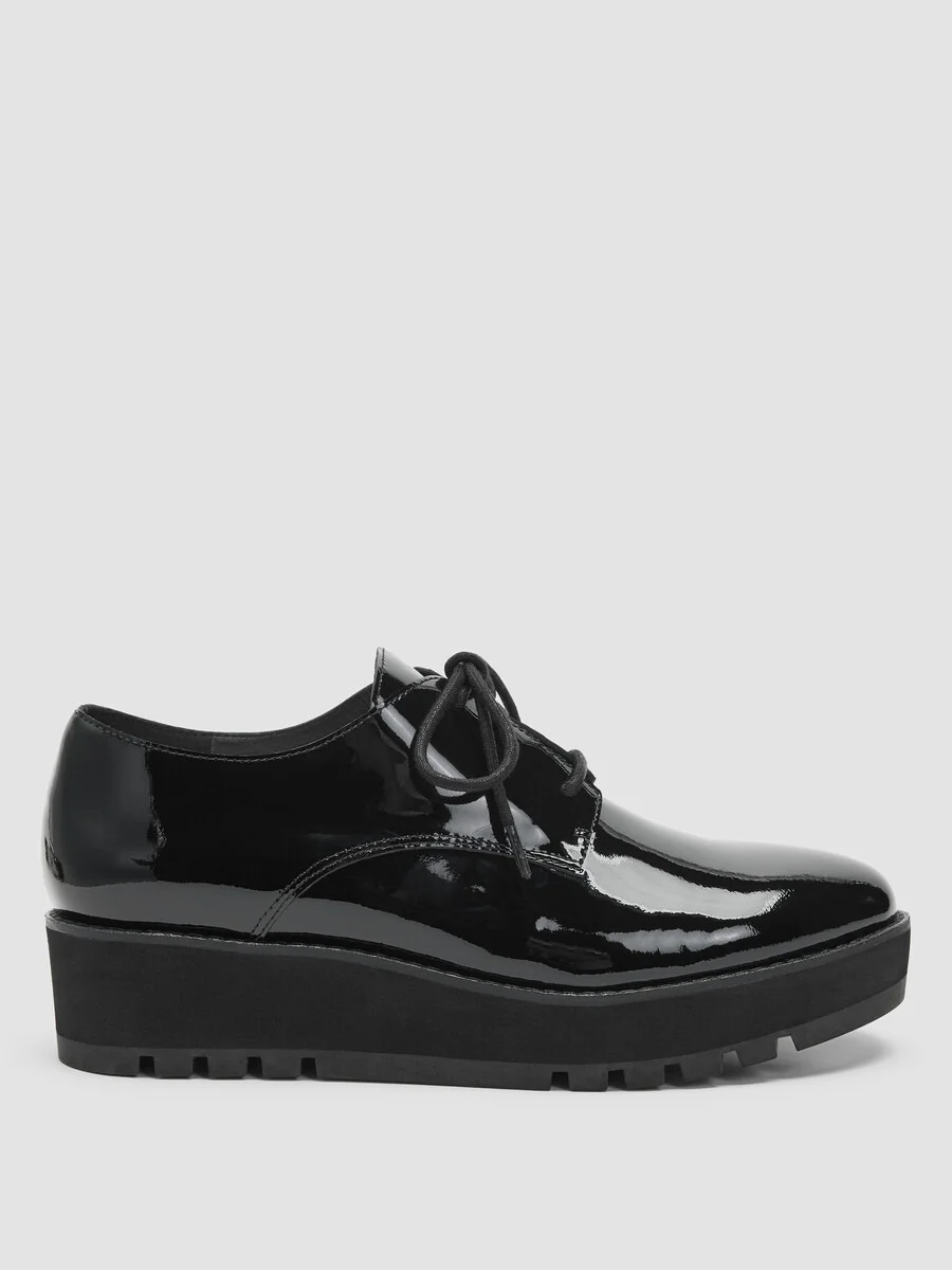 A new take on the oxford—with a platform wedge and classic lace-up styling. In sleek patent leather. Style No. EF46339A DESIGN - EVA heel made in part from sugar cane and 25% recycled content. Tread bottom made in part from recycled rubber. - Only available at select EILEEN FISHER stores. - 2-inch heel, 1-inch platform. - Almond toe, wedge heel. - Lace-up styling. - Padded toe, arch and heel for comfort; leather lining. - Style No. EF46339A FABRIC - Patent leather upper; rubber outsole for comfort, flexibility and traction. - Made in China. SUSTAINABILITY - Leather lining is finished at an LWG Gold-Rated Tannery.