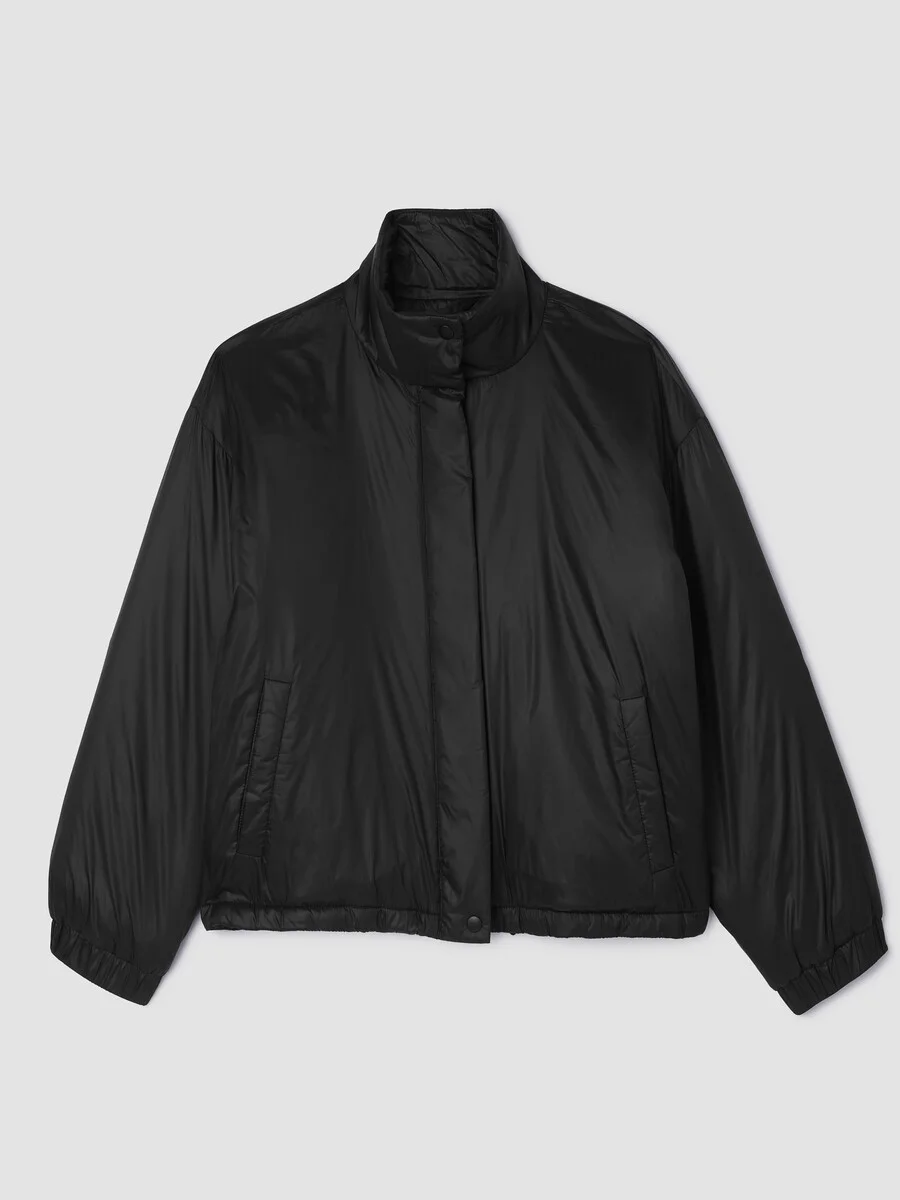 Our take on the puffer. A sporty high collar jacket with an adjustable cord at the hem so you can play with the shape. In a recycled nylon weave that keeps warmth in—and waste out of landfills. Style No. F5GGR-C2169 DESIGN - A generous, boxy fit that drapes away from the body to create movement. - Only available at select EILEEN FISHER stores. - Size S measures 25 inches on the body. Size 1X measures 27 1/2 inches on the body. - High collar with snap at top of collar. - Front placket with zipper and top and bottom snap closure. - Welt pockets with 100% recycled fleece lining. - Elastic cuffs, adjustable elastic cord at hem. - Style No. F5GGR-C2169 FABRIC - A papery weave with softness and subtle luster. With PrimaLoft™ recycled polyester fill made from plastic bottles. - Machine wash cold. Tumble dry low. Do not dry clean. - Made in Indonesia. 100% Recycled Nylon. SUSTAINABILITY - Recycled nylon keeps waste out of the landfill. It's part of our commitment to changing the way clothes are made. - This fabric is bluesign® APPROVED. It's dyed with safer chemistry using less water and less energy, meeting the bluesign® CRITERIA.