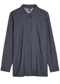 Info & Care Eileen Fisher denim shirt Button-fastening cuffs, box pleat at back, splits at;side, longer back hem Button fastenings through front 100% organic cotton Machine wash Co-ordinating item available Size & Fit Length shoulder to hem: front: 27 inches/ 68.5cm; back: 28 inches/ 71cm Midweight Relaxed fit Model is 5'10"/ 178cm and wears a size small