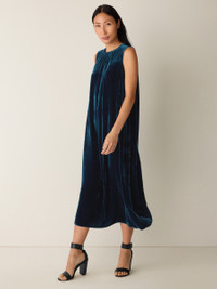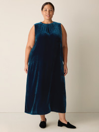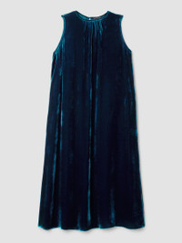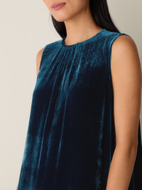 Understated elegance. The round neck dress with shirring at the neckline, in soft velvet with subtle shimmer. Made in a Fair Trade Certified™ factory. Style No. F5VLO-D5402 DESIGN - Close at the shoulders, wider at the hem. A silhouette that fits the body with ease. - Bo Boy is 5'9" and wears a size XS in Atlantis, which measures 50 inches on the body. Size PS measures 46 inches on the body. - Round neck, shirring at center front neckline. - Center back keyhole with mother-of-pearl button closure. - Style No. F5VLO-D5402 FABRIC - Our signature viscose silk velvet, now made in part from pulp derived from recycled cotton. - Machine wash cold. Tumble dry low. Do not dry clean. - Made in Indonesia. 80% Viscose/20% Silk. SUSTAINABILITY - Our Fair Trade Certified™ factories meet rigorous social and environmental standards. By choosing Fair Trade Certified™ products, you’re helping to improve the lives of workers, build resilient communities and protect the environment. - This fabric is bluesign® APPROVED. It's dyed with safer chemistry using less water and less energy, meeting the bluesign® CRITERIA.