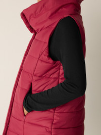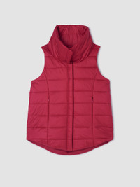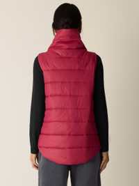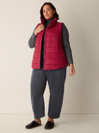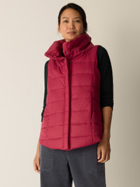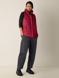 The puffer vest—a seasonal staple with a stand collar and snap button front. In a recycled nylon weave that keeps warmth in—and waste out of landfills. Style No. F5GGR-V0942 DESIGN - Close at the shoulders, wider at the hem. A silhouette that fits the body with ease. - Only available at select EILEEN FISHER stores. - Kalyane is 5'10" and wears a size S, which measures 26 1/2 inches on the body. Size 1X measures 29 1/2 inches on the body. - Stand collar with snap button, fleece-lined pockets, snap button front. - Style No. F5GGR-V0942 FABRIC - A papery weave with softness and subtle luster. With PrimaLoft™ recycled polyester fill made from plastic bottles. - Machine wash cold. Tumble dry low. Do not dry clean. - Made in Indonesia. 100% Recycled Nylon. SUSTAINABILITY - Recycled nylon keeps waste out of the landfill. It's part of our commitment to changing the way clothes are made. - This fabric is bluesign® APPROVED. It's dyed with safer chemistry using less water and less energy, meeting the bluesign® CRITERIA.