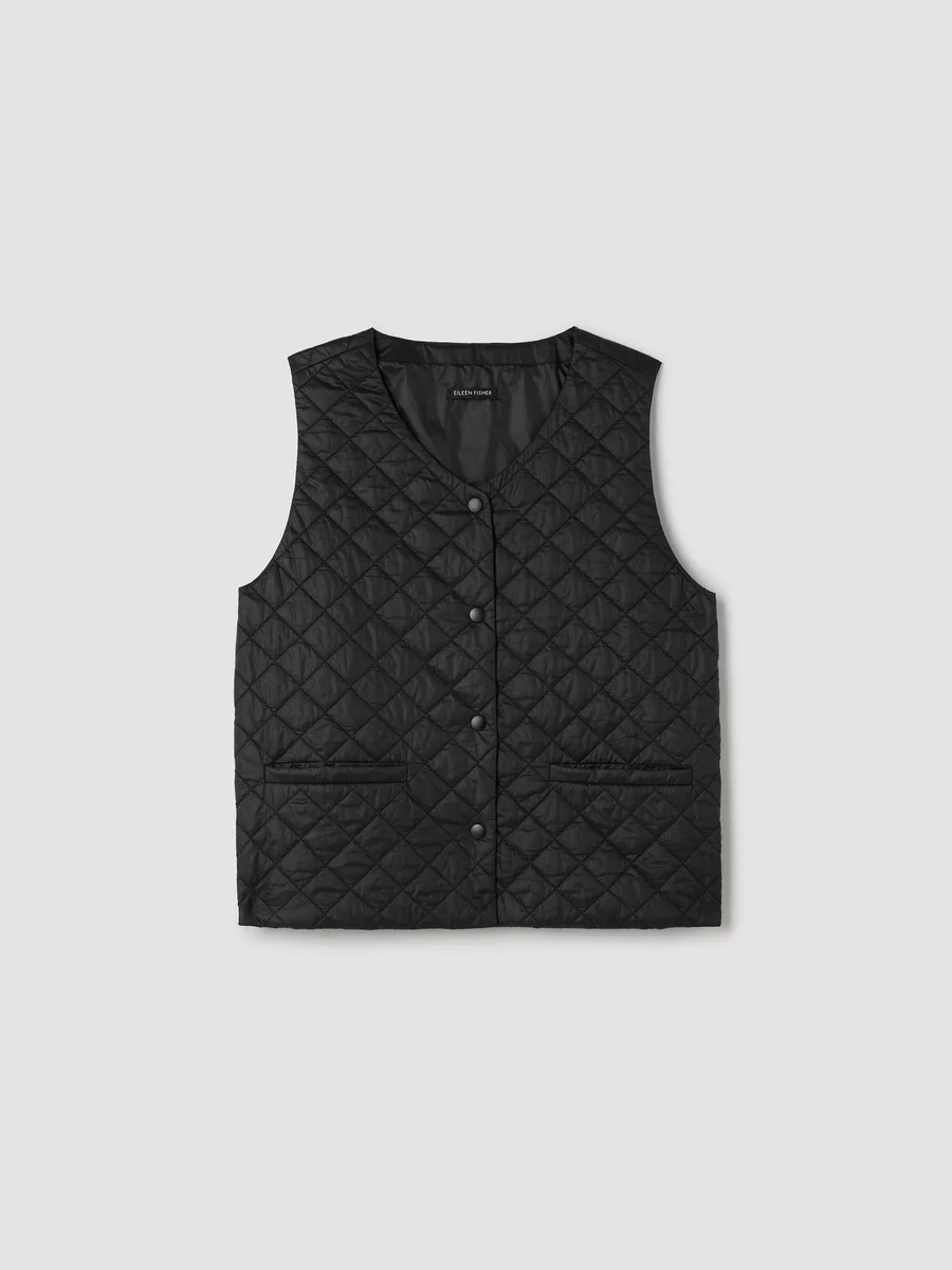 A quilted vest with a V-neck and snap button front. In a recycled nylon weave that keeps warmth in—and waste out of landfills. Style No. F5GGR-V1352 DESIGN - Close at the shoulders, wider at the hem. A silhouette that fits the body with ease. - Kalyane is 5'10" and wears a size S in Reed, which measures 23 inches on the body. Size PS measures 22 inches on the body. Size 1X measures 25 1/2 inches on the body. - V-neck, sleeveless, snap button front. - Front welt pockets. - Style No. F5GGR-V1352 FABRIC - A papery weave with softness and subtle luster. With PrimaLoft™ recycled polyester fill made from plastic bottles. - Machine wash cold. Tumble dry low. - Made in Indonesia. 100% Recycled Nylon. SUSTAINABILITY - Recycled nylon keeps waste out of the landfill. It's part of our commitment to changing the way clothes are made. - This fabric is bluesign® APPROVED. It's dyed with safer chemistry using less water and less energy, meeting the bluesign® CRITERIA.