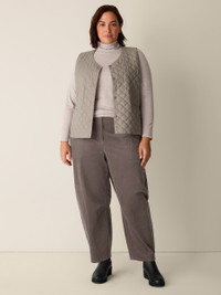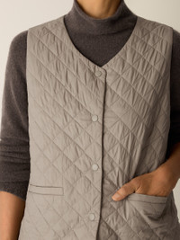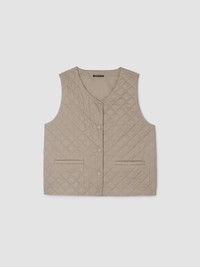 A quilted vest with a V-neck and snap button front. In a recycled nylon weave that keeps warmth in—and waste out of landfills. Style No. F5GGR-V1352 DESIGN - Close at the shoulders, wider at the hem. A silhouette that fits the body with ease. - Kalyane is 5'10" and wears a size S in Reed, which measures 23 inches on the body. Size PS measures 22 inches on the body. Size 1X measures 25 1/2 inches on the body. - V-neck, sleeveless, snap button front. - Front welt pockets. - Style No. F5GGR-V1352 FABRIC - A papery weave with softness and subtle luster. With PrimaLoft™ recycled polyester fill made from plastic bottles. - Machine wash cold. Tumble dry low. - Made in Indonesia. 100% Recycled Nylon. SUSTAINABILITY - Recycled nylon keeps waste out of the landfill. It's part of our commitment to changing the way clothes are made. - This fabric is bluesign® APPROVED. It's dyed with safer chemistry using less water and less energy, meeting the bluesign® CRITERIA.