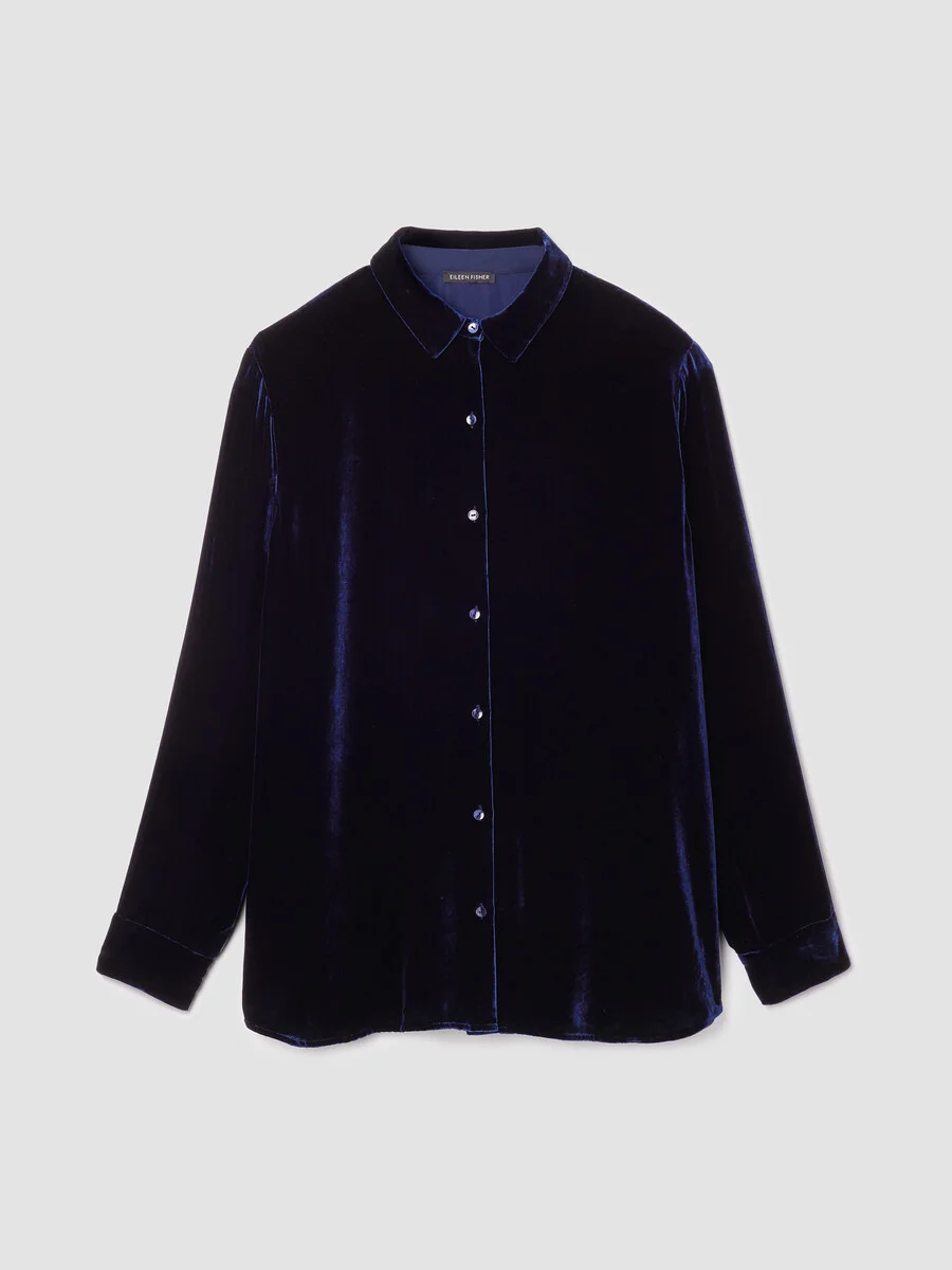 Polished, day or night. A classic collar shirt with side slits, in our shimmery washable velvet. Made in a Fair Trade Certified™ factory. Style No. F5VLO-T6368 DESIGN - Close at the shoulders, wider at the hem. A silhouette that fits the body with ease. - Bo Bay is 5'9" and wears a size XS in Sea Spray, which measures 28 1/2 inches in front and 29 1/2 inches in back. Size PS measures 27 inches in front and 28 inches in back. Size 1X measures 31 1/2 inches in front and 32 1/2 inches in back. - Classic collar, curved hem. - Button front, button cuffs with double pleat. - Back yoke seam, center back box pleat. - Mother-of-pearl buttons. - Style No. F5VLO-T6368 FABRIC - Our signature viscose silk velvet, now made in part from pulp derived from recycled cotton. - Machine wash cold. Tumble dry low. Do not dry clean. - Made in Indonesia. 80% Viscose/20% Silk. SUSTAINABILITY - Our Fair Trade Certified™ factories meet rigorous social and environmental standards. By choosing Fair Trade Certified™ products, you’re helping to improve the lives of workers, build resilient communities and protect the environment. - This fabric is bluesign® APPROVED. It's dyed with safer chemistry using less water and less energy, meeting the bluesign® CRITERIA.