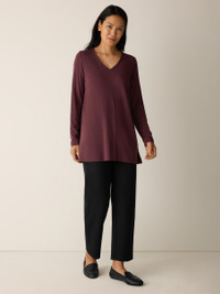 Relaxed and refined. A drapey V-neck top with long sleeves, in our Fine Jersey made from Tencel™ Lyocell. Style No. F5FTE-T6260 DESIGN - Close at the shoulders, wider at the hem. A silhouette that fits the body withease. - Only available online. - Kalyane is 5'10" and wears a size S, which measures 30 inches on the body. Size1X measures 32 1/2 inches on the body. - V-neck, long sleeves. - Center front seam. - Style No. F5FTE-T6260 FABRIC - A body-skimming jersey that goes from day into night. Polish that's right forany occasion. Tencel™ Lyocell fiber is made from responsibly harvested trees. - Machine wash cold. Line dry. - Made in Vietnam. 95% Tencel™ Lyocell/5% Elastane. SUSTAINABILITY - Tencel™ Lyocell fiber is made from responsibly harvested trees.